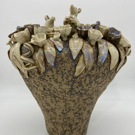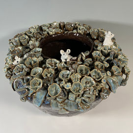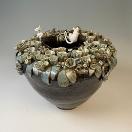 A series of vessels featuring anthropomorphic mice searching through a field of flowers in hopes of finding a lucky turn in life. Each vessel is created with two different stoneware clays and features glazes which react differently on each. The glazes intensify in color with thickness of application creating an unpredictable result.